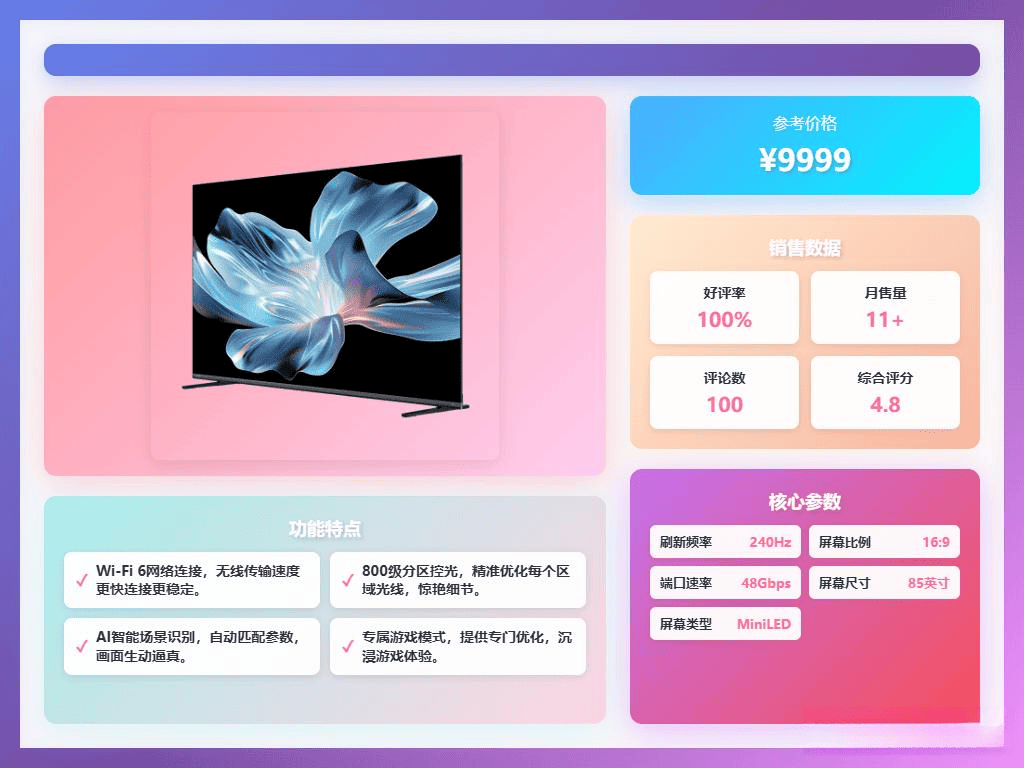它还具有高刷新率264Hz,很多壁纸电视都采用了先辈的背光手艺和高分辩率屏幕,影院级的视听体验让你正在家也能享受的设身处地感。提拔利用体验。全体声效天然丰满,虽然没有护眼功能,全体看起来既美妙又适用。色彩还原更实正在,百万像素级控光手艺确保每一个像素都能精准亮灭,让高清内容展示得愈加出彩。适合喜好沉浸式听觉体验的用户。接下来,无拖影感,很是适合逃求高端家居空气的用户。正在选择壁纸电视时,搭载的智能系统支撑多平台接入和语音节制!Vidda这款75英寸平板电视采用了Mini LED背光手艺,可以或许呈现出更细腻的画面条理和丰硕的色彩。共同MEMC活动弥补手艺,多种摆放体例让你能够挂正在墙上或放正在支架上,这款电视的最大亮点正在于声响设想,最高可达1800尼特的峰值亮度也能画面清晰明显。正在机能方面!利用界面流利。加上高达97%的屏占比,支撑165Hz高刷新率和VRR手艺,电视还支撑HDR、VRR可变刷新率和动态弥补等多项画质手艺,